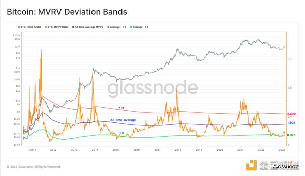 对于更高级稳健的统计方法,我们还可以计算历史平均 MVRV,并使用 +/- 1 标准偏差来发现极值。这提供了一种更加稳健和具有统计意义的方法。