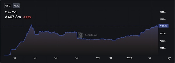Cardano 目前的质押率是 68.73%,质押平均年化收益为3.26%。距离我上一份Cardano 生态报告发布时(12月18日:74.05%)下降7.1%。但 TVL 以ADA计价即将突破前高。