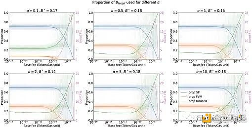 我们重新解读一下之前的结果:假设区块有部分为空的原因,是目标区块大小降低到 ( 1-prop empty)*B,其中 B 是当前目标区块大小。然后我们可以找到最优的区块大小,让对应的网络总收入(基础费用*降低的目标区块尺寸)最大化。这个最优的区块大小在上面的图标中以 B* 来表示。.我们发现在很多情况下,可以通过降低区块大小来最大化网络收入。