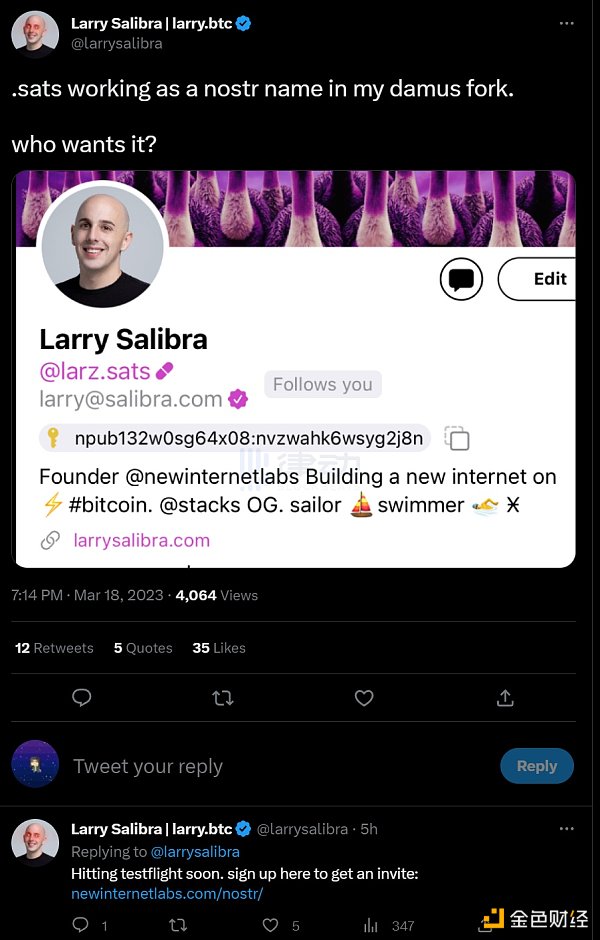 又比如,基于去中心化社交协议 Nostr 的首个社交应用「Damus」即将支持以 .sats 域名作为用户名。