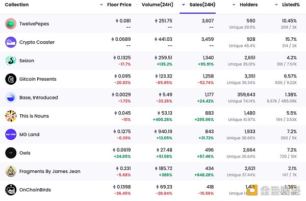 24小时NFT交易量、交易量前十项目 数据来源:Coinmarketcap