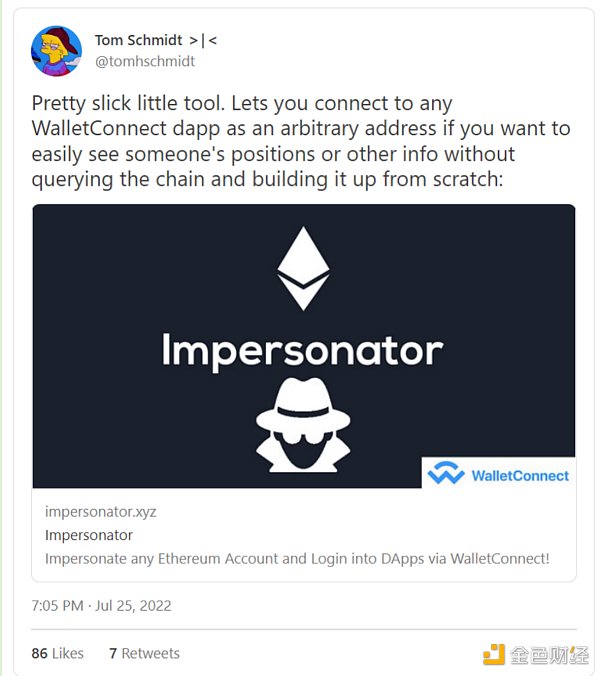 Impersonator是由NFTX的首席协议开发者Apoorv Lathey在2022年开发的工具。它支持用户通过WalletConnect模拟任一以太坊地址登录web3应用程序。