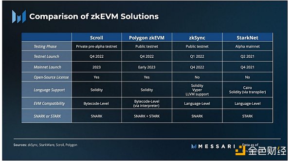 相比之下,ZK类型的扩展特性使得ZK rollup一开始使用定制的VM,这意味着项目因此要做更多工作来“诠释”EVM中的代码或使用全新编写的新代码。然而,截至2023年3月,多个ZK rollup项目都即将公布实施自己的zkEVM!