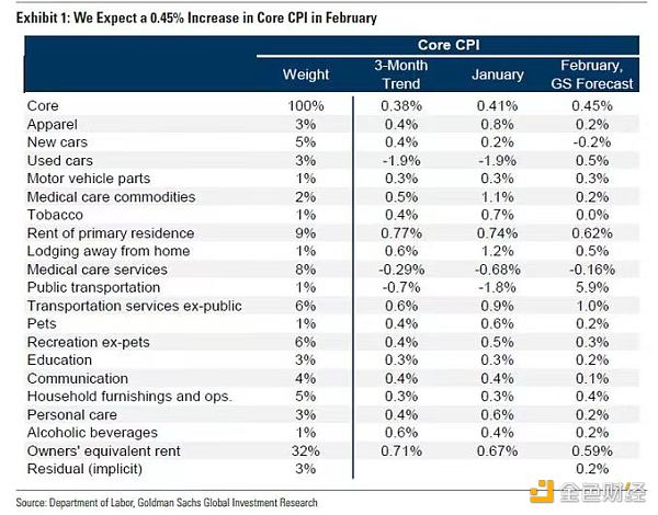 在投行预测方面,高盛预计美国2月核心CPI月率将较1月进一步上升:高盛预计美国2月核心通胀将环比上升0.45%(市场一致预期为0.4%,1月核心CPI月率为0.41%),同比上升5.56%(市场一致预期为5.4%)。