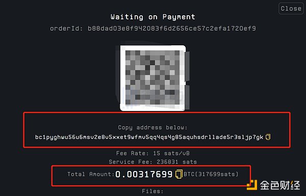 「Copy address below」下方显示的是打款地址,「Total Amount」显示的是打款金额。使用自己的比特币钱包完成转账以后等待铭文到账即可。