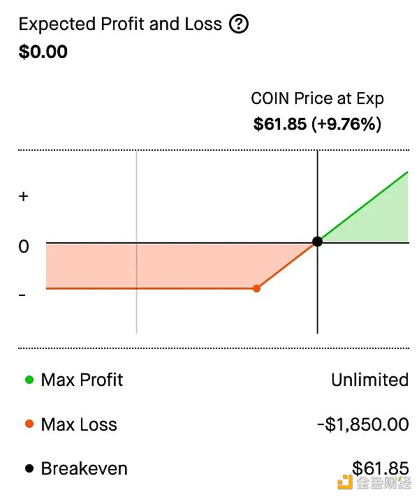 在 COIN 交易价格超过 61.85 美元(60 美元行使价 + 1.85 美元溢价)之前,你的朋友不算获利,但在最初的 1850 美元投资之外没有任何风险敞口,COIN 超过 61.85 美元的每一分钱都是真正的利润。