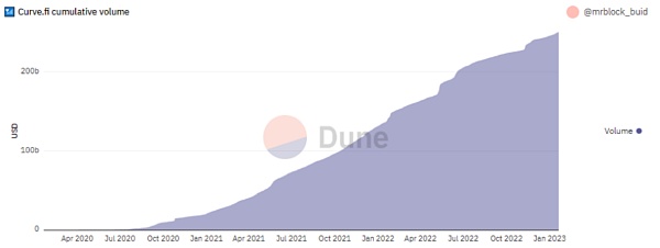 更具体地说,Curve的流动性Pool对以下交易进行了优化:稳定币(如USDC/USDT)和与相同基础价值挂钩的资产(如StETH/ETH、WETH)之间的交易。由于Curve为低波动性的资产交易提供了最高的流动性,人们纷纷涌入该平台,自成立以来,累计交易量超过2500亿美元。自2018年11月2日成立以来的累计交易量超过2500亿美元。