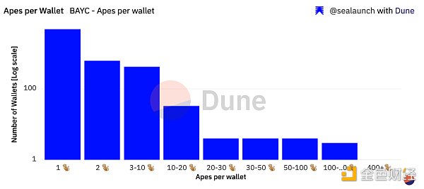 BAYC 在每个钱包的分布显示了一个更广泛的社区,持有者集中的比例相对更低,相比之下,BAYC的独一持有人比例(60%)高于其他流行的NFT项目,如Azuki(50%),CloneX(50%)或 CryptoPunks(37%),这表明 BAYC 社区会更大。