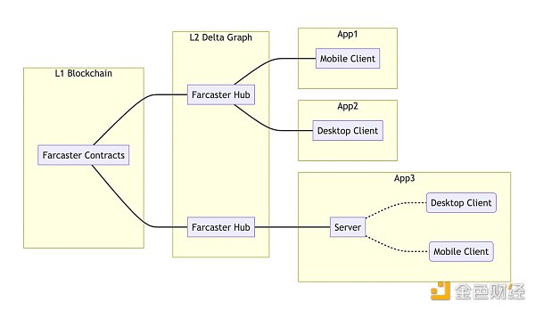 另一部分是用户控制的服务器,即所谓的 Farcaster Hubs。用户数据通过身份加密签名后存储在链下,因为在大多数L1和L2网络上结算成本高昂且速度慢。该架构指定了谁可以创建或访问内容,还可以允许其他链上身份(如ENS)的支持,从而使用户可以将其Web3身份和声誉无缝带入 Farcaster 生态系统,并以用户控制的方式将其现有身份特征导入该项目中。