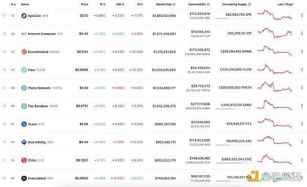 24小时NFT交易量、交易量前十项目 数据来源:Coinmarketcap