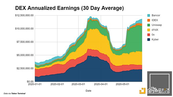 Token Terminal一直在跟踪主要DEX(Bancor,IDEX,Uniswap,dYdX,0x和Kyber)的预期年化收入,2020年有望在创下1200万美元的新高。对于DEX,收入主要由交易量驱动,因为平台通常会收取交易者的交易费。 3月份的前期高点接近1250万美元,当时由于黑色星期四和金融市场的不确定性,交易量激增。