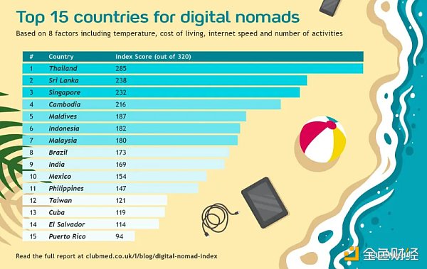 英国 ClubMed 在 2021 年根据气候、生活成本、网速和线下活动数量等指标罗列了最适合数字游民的 15 个国家,其中泰国第一,不过其中新加坡排名第三,略显离谱。