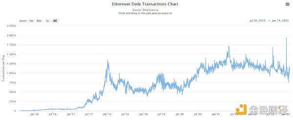 尽管价格下跌,但去年的交易量仍保持良好。今年该网络下降了 12%。话虽如此,过去 6 年的复合年增长率为 76%,过去 5 年的复合年增长率为 32%。随着第 2 层扩展,我们开始看到基础层的交易增长开始趋于平稳。