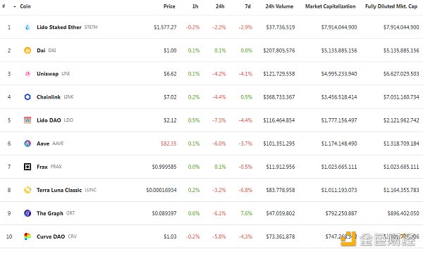 DeFi项目锁定资产前十排名及锁仓量 数据来源:defillama