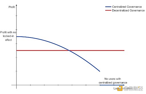 随着锁定效应的增加,描绘去中心化治理利润的红线不会改变。但是随着锁定效应的增加,中心化治理的利润“蓝线”向下倾斜。这似乎违反直觉,因为更大的锁定效应允许企业家在开发阶段获得更高的利润。但总的来说,诱导用户加入网络的成本要高于未来利用他们所产生的利润。结果可能令人惊讶,中心化治理的利润最终将低于去中心化治理所能实现的利润。