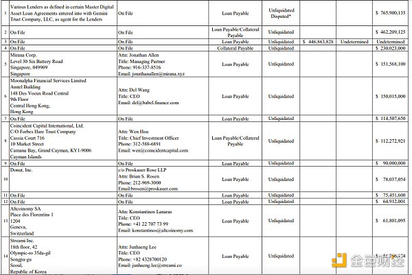 在破产文件中Genesis还公布了其前50大无担保债权人名单,50大债权人向Genesis的索赔总价值超过36亿美元。