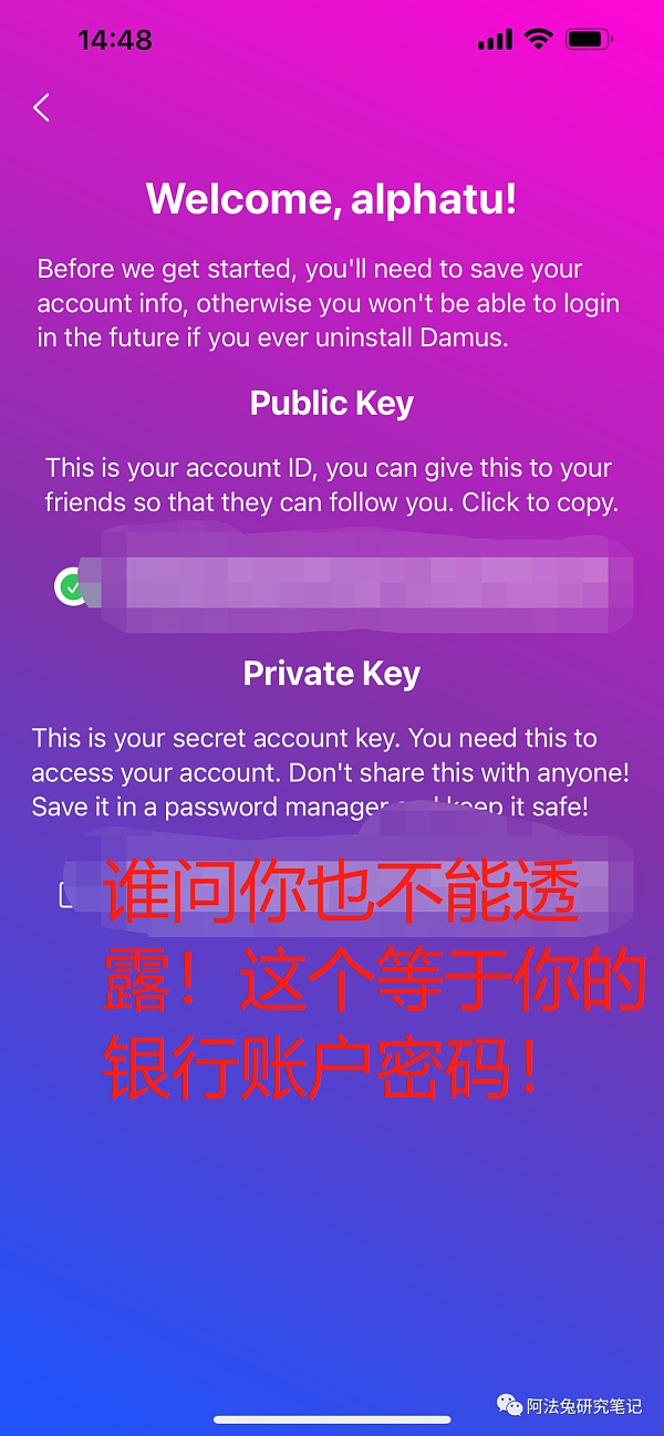 注意保存私钥,因为它是将来恢复和重新登录你的账户的唯一途径,如果拿Damus来举例,就是我昨天发的那张图: