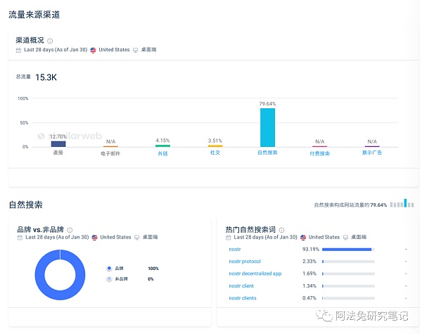 我们能看到,大部分还是从自然搜索来的,然后出站流量的话,由于Nostr官网没有提供太多的说明性文字,Github的位置放置的比较醒目,信息主要都在Github上,所以出站流量主要去了Github