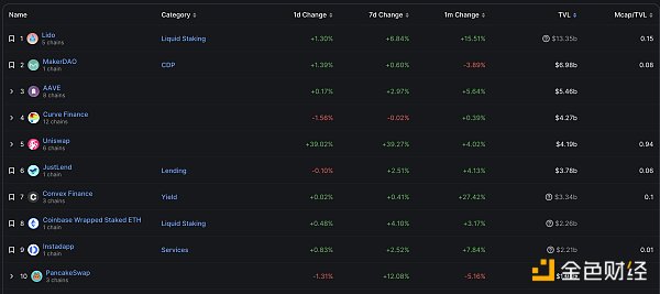 DeFi项目锁定资产前十排名及锁仓量 数据来源:defillama