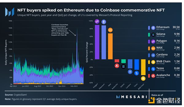 尽管以太坊在每日唯一NFT买家数量方面也处于领先地位,但它与其他链相比,这一指标上的差距在交易量差距要小。以太坊日均唯一NFT买家季度环比增长了88%。2月底,Coinbase在以太坊上发布了一个纪念NFT,以庆祝其Base L2的发布。“Base, Introduced”系列有几天的免费铸造时间,在2月26日这一天达到了唯一买家数量峰值,超过了12.2万。