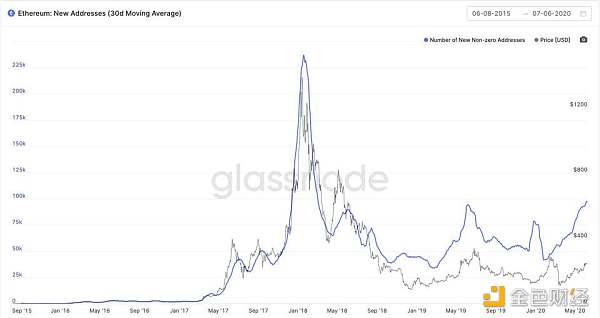 因此,具有非零余额的以太坊地址总量是个不错的评估指标,该指标可以表明以太坊网络的实际使用情况,目前这个指标数字接近 4000 万。根据 Glassnode 的分析数据显示,该指标的每日增长量正在加速,持有 ETH 的新以太坊地址数量刚刚超过 10 万,以 30 天平均值来看,这个数字创下了自 2018 年 3 月以来的最高水平。