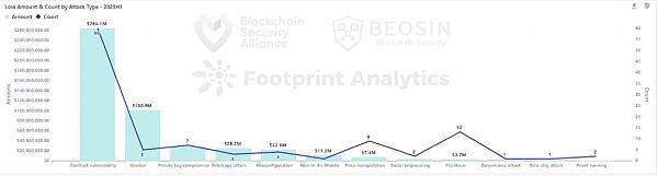 2023年上半年,DeFi类型项目共发生 85 次安全事件,占总事件数量的 78.7% 。DeFi总损失金额达到了 2.92 亿美元,占总损失金额的 62% 。DeFi为被攻击频次最高、损失金额最多的项目类型。