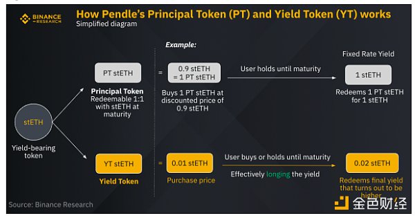 该协议因为提供LST的收益农场和高APY而在加密社区中受到欢迎。这是通过收益代币化实现的,即将一种收益产生的代币分割为主体代币(PT)和收益代币(YT)。下图33是一个简化的图表,用于说明其工作原理。