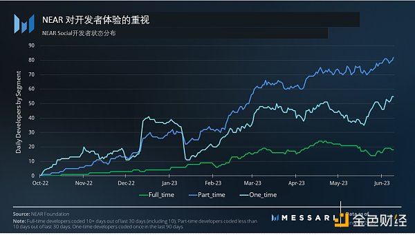 NEAR 在季度报告中展现了他们对创建一个对开发者友好的生态系统的重视。为了激励开发者,NEAR 代币将自动分配给开发者,其中来自交易的总手续费的 30% 将分配给发起交易的合约。此外,NEAR 推出了 JavaScript SDK,使开发者能够使用 JavaScript 进行构建,除了 Rust、AssemblyScript 和 Solidity。自三月初以来,NEAR Social 的开发者基础在所有领域都有所增长。