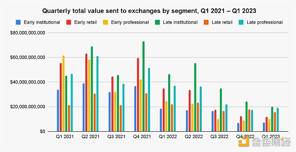 总的来说,大部分季度中,各个群体向交易平台发送的价值基本持平,除了晚期零售钱包和早期机构钱包,它们在这个时间段内向交易平台发送的总价值分别占 11.4% 和 11.9% 。
