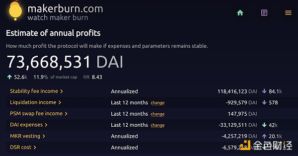 如下图所示,MakerDAO 一年的净利润预计为 7367 万美元。根据当前数据,Maker 一年的稳定费(包括 RWA)收入预计为 1.18 亿美元,支出的 MKR 折合 426 万美元,DSR 支出预计 658 万美元,过去一年清算支出 93 万美元,PSM 交易费用收入 15 万美元,DAI 支出 3313 万美元。