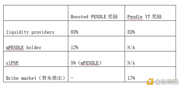 用户可通过Penpie将PENDLE转换为mPENDLE,协议则收集来的PENDLE质押为vePENDLE为LP实现挖矿boost。Boost收入将83%分配给LP,12%分配给mPENDLE holder,5%分配给vlPNP。团队计划将vePENDLE权益中的YT奖励的17%分配给Bribe市场,但目前仍未上线。