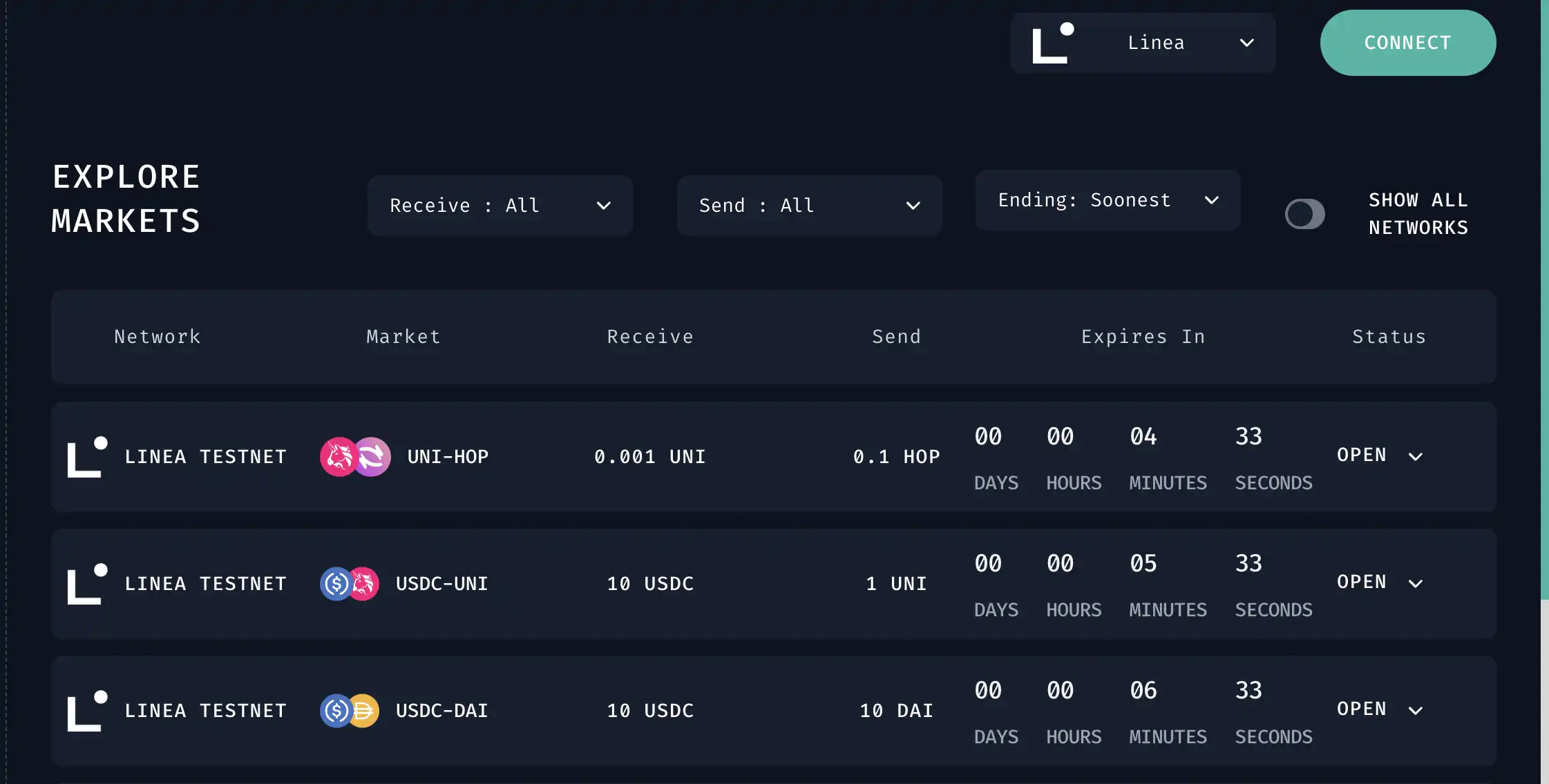 跨链桥方面,根据官方生态页面信息,除了官方桥和大家熟知的 Celer(已支持 Linea 主网)、Li.Fi、Orbiter、Stargate 以外,还有几个并不常见的跨链桥将支持 Linea 主网。