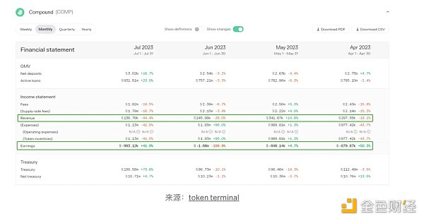 Compound协议收入来源只有存借款息差,因为没有官方提供的统计网站,为了保持口径的统一,所以都以Token Terminal数据为参考。