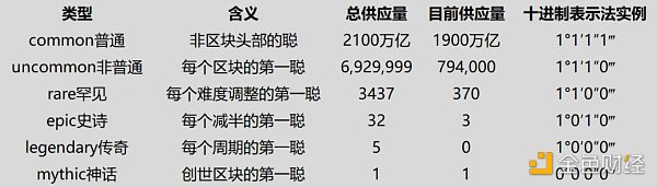需要特别说明的是,外国社区将这五类(除去 common)统称为 rare satoshi,而其中的罕见聪则被命名为大写的 Rare Satoshi。