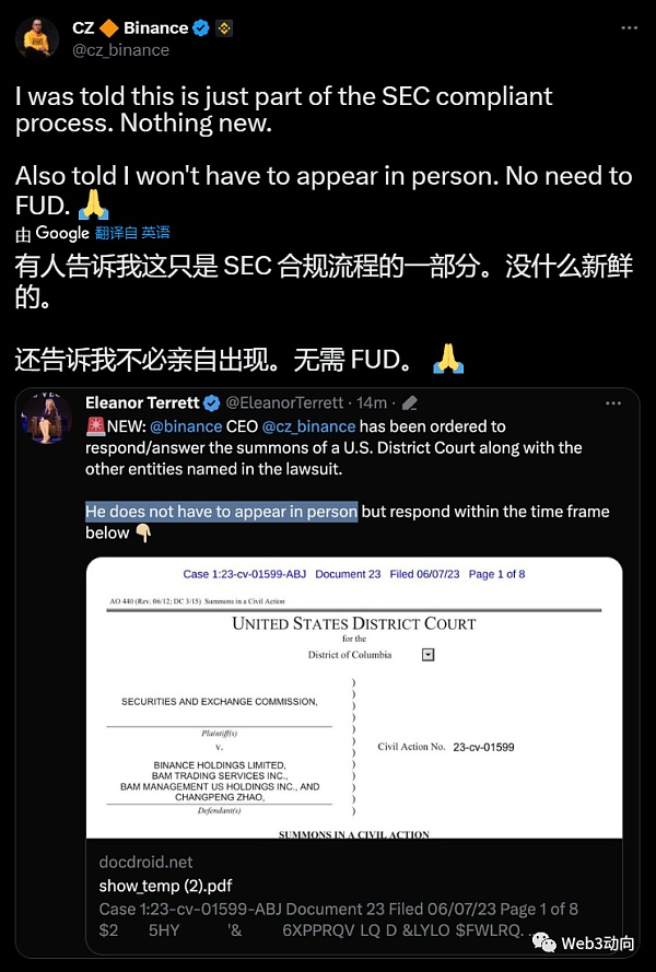 面对SEC的指控,赵长鹏轻车熟路的在推特上回应着这一切:团队已经在待命,确保系统稳定,包括取款和存款业务。安抚用户、积极应对的姿态似乎获得了不错的公关效果。