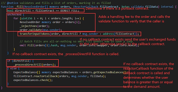 Reactor 合约调用填单者的 Executor 合约,其中包含特定的订单执行逻辑。一旦确定资产来源,Executor 合约将资产发送到兑换者的地址,并从兑换者地址提取资金。最后,Reactor 合约验证订单是否满足条件。