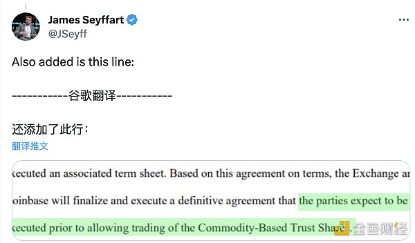 Bloomberg Intelligence 分析师 James Seyffart 在周二的推文中指出了 Cboe 的修订,并补充说,文件中还指出 Cboe 和 Coinbase“将敲定并执行一项最终协议,双方预计将在允许基于商品的信托股票交易之前执行该协议。” ”
