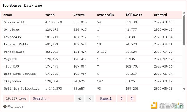 对Space进行更深入的数据分析后发现,会发现大多数Space都属于 "无意义 DAO",只有极少数(少于 10 个)关注者、提案和投票者,并且缺乏网站或社交媒体地址等基本要素。这些 DAO 可能是由投票矿工创建的(用于空投,如 Gitcoin Passport),很少提交提案,或者充斥着毫无意义的提案,如 "BTC 会跌破 30,000 美元吗?"或 "2022 年第二季度加密货币市场看涨吗?"或 "你们都参与空投了吗?" 如果将超过 100 名投票者定义为积极活动的 DAO,这个数字大约为 2k。