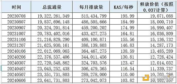 根据代币排放表,计算了 2023 年 7 月至 2024 年 6 月期间,KAS 代币每个月排放量以及释放价值,具体如下表所示。如果按照 0.037 的价格计算, 2023 年 7 月份,KAS 将排放价值 1900 万美元的代币,此后逐渐降低;至 2024 年 6 月,排放价值约 1000 万美元的代币。