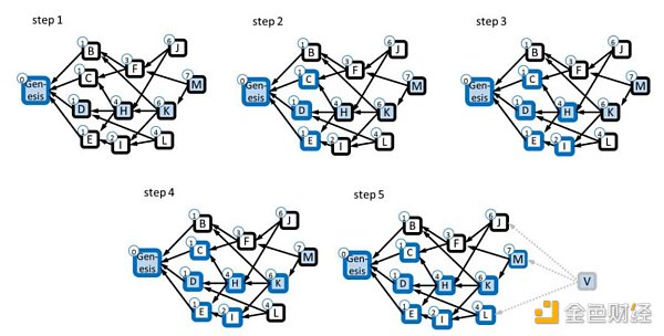 步骤 5 ,区块 V 是一个虚拟的块,该区块的过去就等于整个当前的 DAG。