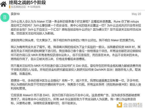 不过对此也有不同的观点,在 MakerDAO 终局计划的提案下,有用户评论道,Maker DAO 发行新链不是一个好主意甚至有点愚蠢,更应该关注如何为 MKR 代币赋能以及如何扩大 DAI 规模。