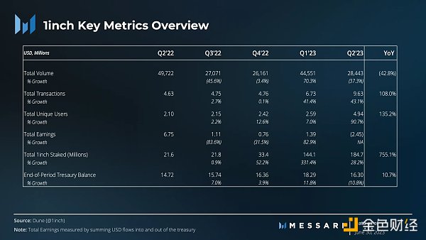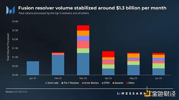 第二季度,1inch Network 的总处理交易量超过 280 亿美元,比第一季度下降了 37% 。然而,这种下降不仅仅是由于第二季度的交易量减少,还跟 2023 年 3 月 USDC 脱锚事件导致第一季度交易量膨胀有关。除去 3 月 10 日至 16 日这一周脱锚期间的交易量,代之以第一季度其他时间的平均交易量,该季度总交易量应为 345 亿美元,这意味着第二季度仅比第一季度减少了 19% 。