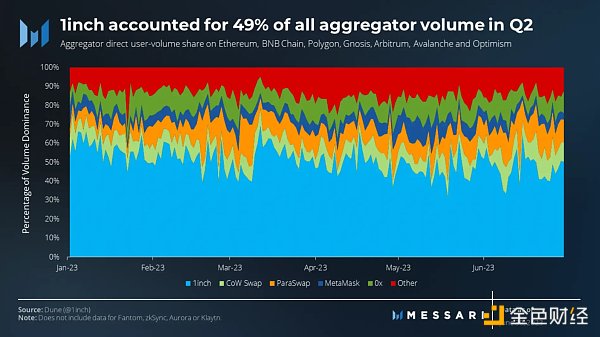紧随1inch之后的是 ParaSwap,它占所有直接用户数的 11% 。“其他”类别,包括超过 15 个不同的聚合器,占第二季度直接用户数的 15% 。聚合器的版图似乎正在扩大,本季度市场份额略有重新分配。