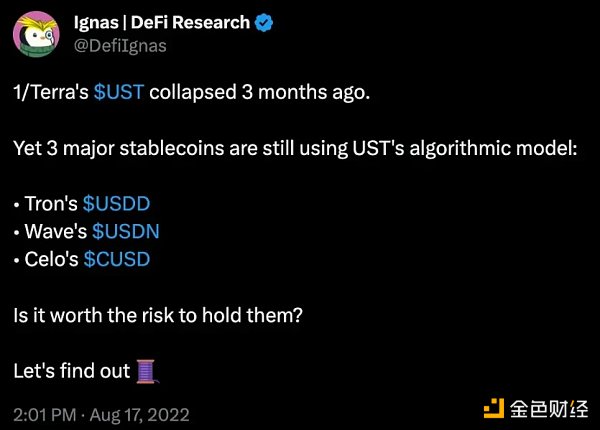 例如,就在一年前,我写了篇关于 USDD、USDN 和 CUSD 算法稳定币的文章。几个月后,USDN 脱锚并重新命名为另一个 VOLATILE 代币。