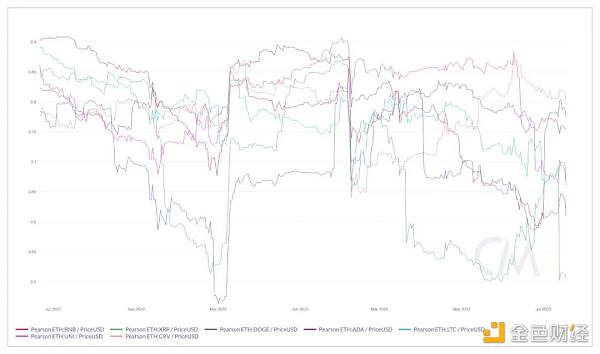 ETH 与除 BTC 外其他主要加密货币相关性变动,截至 2023 年 7 月。来源:CoinMetrics