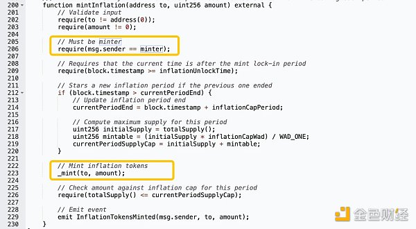 如果 owner 设置了一个非零 minter,该 minter 就可以随意调用 mintInflation 对任意地址无限量增发代币。