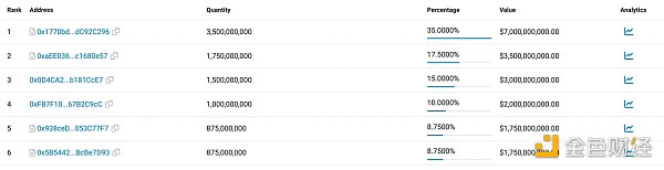 经过统计,前 6 个地址已经持有了 94.5% 的总发行量,这说明代币分配非常集中。