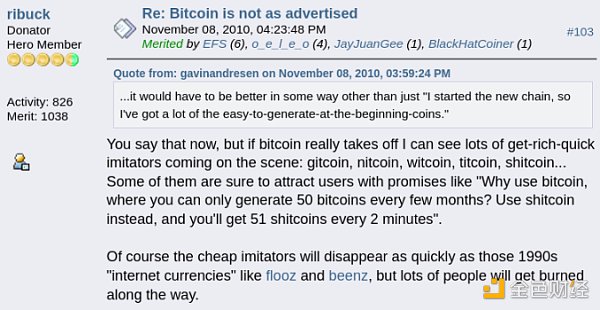 很久以前,在 「比特币 Twitter」还没有形成一个社区的时候,比特币讨论和文化的谢林点是 BitcoinTalk 论坛。那是一个单纯的时代,有数以百计的新网络发布,他们的创造者定期在 altcoins 板块上发表[ANN]帖子来宣传。几乎所有的项目都是对比特币代码库的简单修改,变化主要就是营销,没有什么实质内容。「shitcoin(山寨币)」这个词也是在创造毫无价值的比特币山寨品的背景下首次出现的: