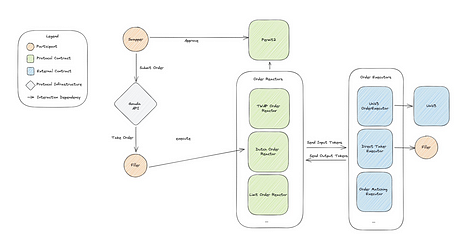 交易者的订单通过Filler网络传播,Filler竞争执行该订单,并将订单与交易者的资金和Filler保证金一起提交给源链上的反应器合约。Filler通过在目标链上转移交易者所需的资产来填充订单。目标链上的反应器合约记录了在指定截止日期之前填充的订单,并通过结算预言机向源链上的反应器合约传递消息,确认交易者订单的履行。然后,交易者的资产和保证金会在源链上释放给Filler。如果Filler在证明期限之前未能执行订单,交易者将从源链上的反应器合约中收回他们的输入资产和Filler的保证金。