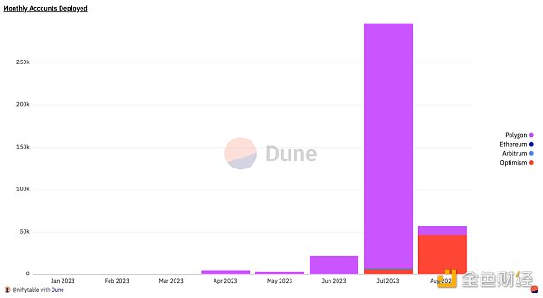 今年7月,Polygon经历了ERC-4337使用量的大幅飙升,原因是CyberConnect社交网络的推出,该网络的所有账户都是ERC-4337钱包。CyberConnect仅在7月份就进行了大约36万笔UserOps。